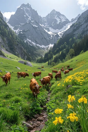 Cows in alpine meadow, majestic mountains, clear sky, vibrant greenery