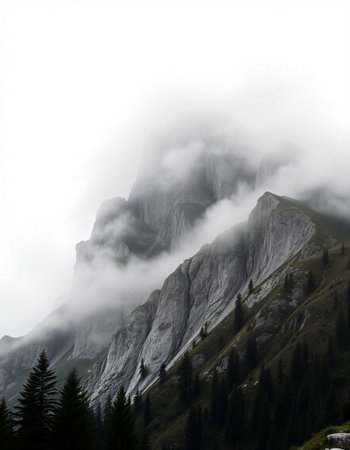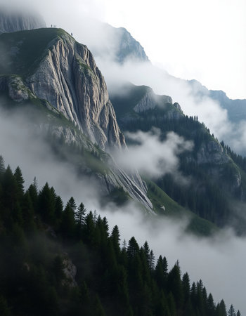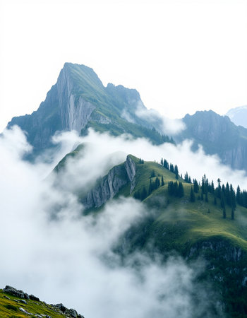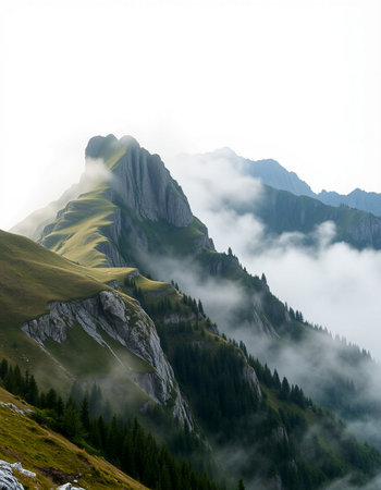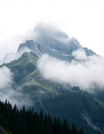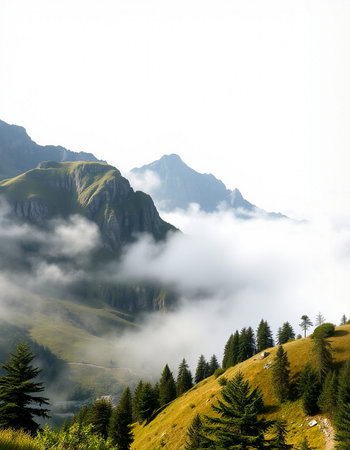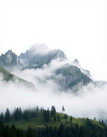 A misty morning in the mountains of Switzerland, with rolling hills and forests shrouded by fog, creating an ethereal atmosphere. The photograph captures the serene beauty of nature's tranquility. --ar 3:2 --v 6.1 Job ID: 7b93aa38-cba9-4afe-9609-19f108f7f677