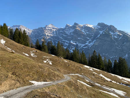 Trails for walking, hiking, sports and recreation around the Klöntalersee reservoir lake (or Kloentalersee) and on the slopes of the Klöntal alpine valley - Canton of Glarus, Switzerland (Schweiz)
