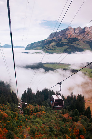 SEp 29, 2013 Engelberg, Switzerland - Ropeway Gondola flying over fog covered green pine forest alpine mountain valley of mount Titlis foot area.