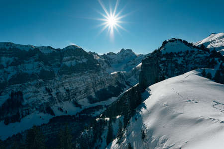 Beautiful sunny snowy mountain landscape on Ebenalp in Appenzell