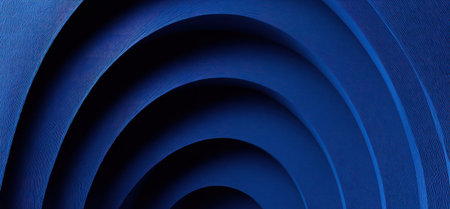 An abstract graphic presents a series of concentric arcs in shades of blue. The composition emphasizes repeating curved forms creating depth through layered shadows and variations in color. Suitable for various design applications, it offers a visual element adaptable for commercial and editorial purposes.