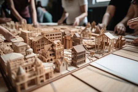 Model of town built from wooden building blocks, housing and urban development concept