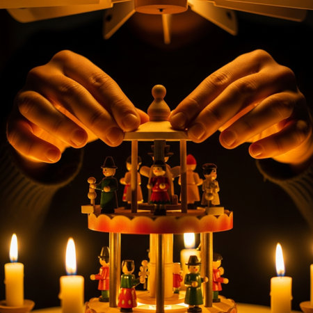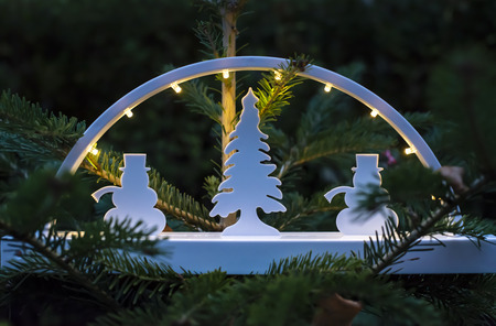 handmade candle arch from Germany based mountain range Erzgebirge standing on parquet and illuminates the floor on Christmas time