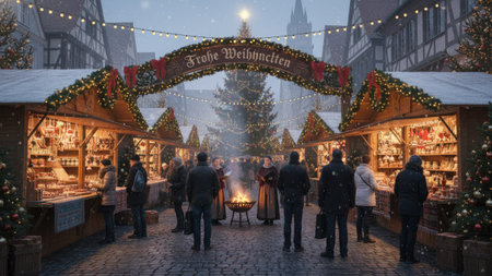 A Christmas market scene features numerous stalls adorned with lights and decorations, with a central archway proclaiming festive greetings. People are gathered, possibly shopping or socializing. The image showcases warm lighting against the backdrop of architecture, suitable for commercial projects promoting the holiday season.