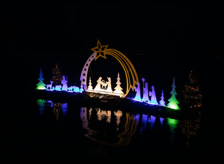 Velden, Austria - December 20, 2024: Schlosshotel am Woerthersee features stunning holiday lights reflecting on water, creating a festive winter ambiance with Christmas trees