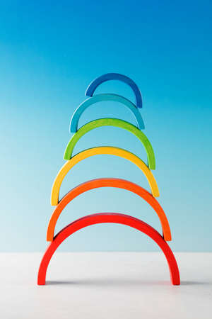 A bright wooden rainbow on a blue background. The concept of developing childrens toys, a toy store.