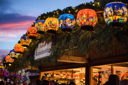 Vienna, Austria - December 24, 2017. Lighting painted glass candle holders with colorful ornaments in kiosk at Viennese Christmas market. Close view of Xmas fair stall selling souvenirs and gifts.