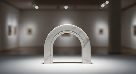 A modern, white marble sculpture in the shape of a double arch is spotlit in the center of a minimalist art gallery. The gallery background is blurred, showing white walls and other framed artworks.