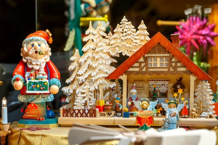 BERLIN - DECEMBER 09, 2015: Christmas market on the square near the Kaiser Wilhelm Memorial Church. Souvenirs and gifts. Little wooden man.