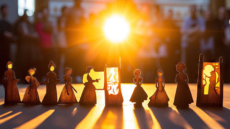 Intricate silhouettes showcase artistic designs against a vibrant backlight, casting dramatic shadows and creating an engaging atmosphere in a cultural setting.