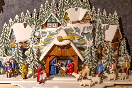 Prague,Czech Republic, December 12, 2019: Hand made Nativity scene made from wood in Prague