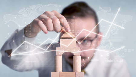 Young handsome businessman using wooden building blocks with data and calculations behind him
