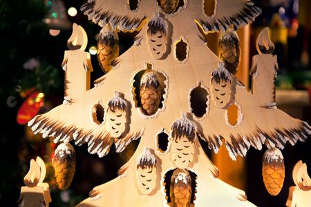 Wooden toys on the background of the Christmas tree in the workshop