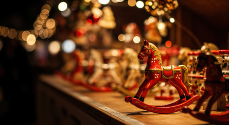 A delightful display of traditional red rocking horse toys glows warmly on a market stall under soft, blurred holiday lights, creating a magical and nostalgic Christmas atmosphere.