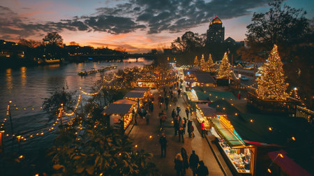 Riverside Holiday Market at Dusk with Glowing String Lights. Christmas street decor.