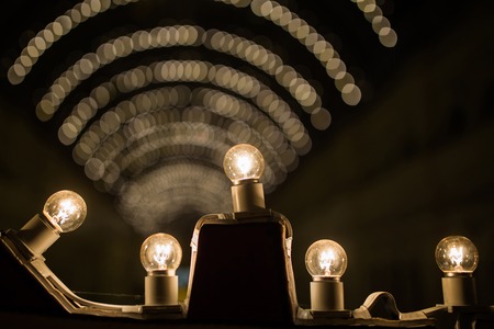 Blurred defocused city lights, Golden Outdoor decorations bublles and fairy lights.