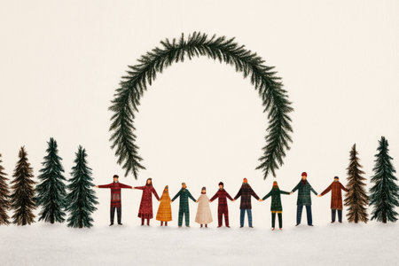 A diverse group of people holding hands in a winter forest, adorned with pine branches, celebrating togetherness and community spirit during the festive season