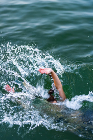 Triathlon swimmer churning up the water in the sea.. Athlete practicing for triathletic race in lak