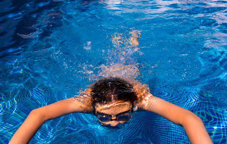 Young girl in goggles and cap swimming butterfly stroke style in the blue water pool