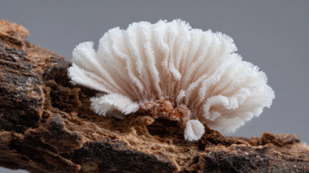 A stunning white mushroom displays intricate details while growing on a piece of old wood.