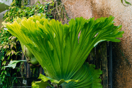 Staghorn fern called Platycerium superbum grows tall and green with textured leaves. High quality photo