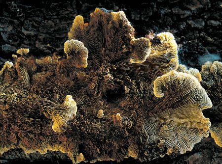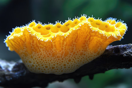 Yellow organic growth on a wet surface showcasing intricate textures and details under natural light