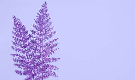 Very Peri toned photo - colour of the 2022 year. Minimal flat lay with two purple leaves and copy space on white background