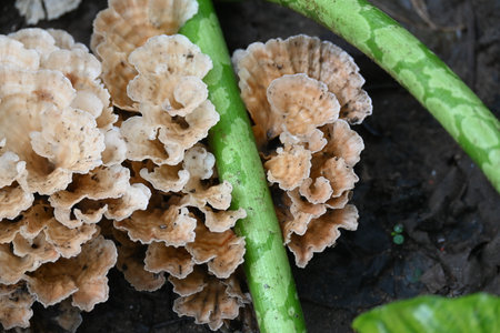 Close-up beautiful wild mushrooms, Microporus Xanthopus mushroom grow on the tree branch in rainforest