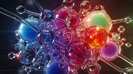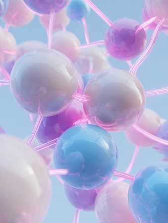 This image showcases a detailed illustration of a molecular structure, featuring interconnected atoms and bonds. The composition uses a network of spheres in varying sizes and colors. The design employs a shallow depth of field, giving it a modern and scientific look, suitable for educational or conceptual purposes.