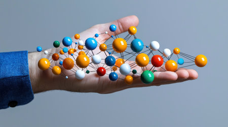 A hand holding a bunch of colorful balls in a pattern that resembles a network. Concept of complexity and interconnectedness, as the balls are arranged in a way that suggests a web of relationships
