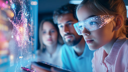 Dynamic group of students engaging with futuristic technology in a modern open-space setting, showcasing interactive learning through virtual reality tools with vibrant digital displays in a collaborative atmosphere.