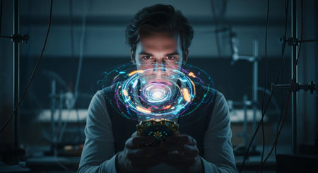 Scientist holding advanced glowing microchip with a floating digital circuit model in futuristic lab.