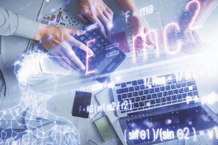 Double exposure of man and woman working together and formula hologram drawing. Computer background. Top View. Education concept.