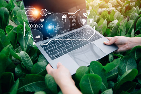 Hands interacting with a laptop displaying innovative smart farming technology. The digital interface showcases crops and agricultural data, symbolizing modern agricultural practices.