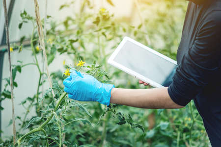 Farmer inspecting tomatoes and using tablet computer for analysis. Agriculture innovative technology concept