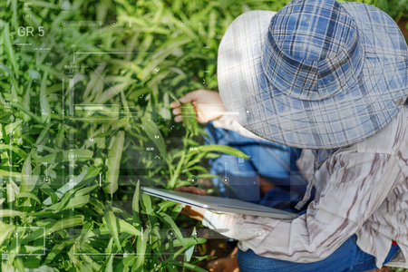 Modern agriculture science and technology concept. Farm researcher staff working overlay IOT tech icon.