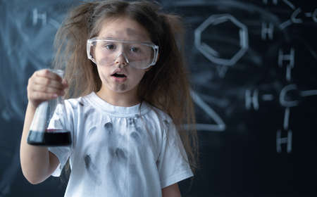 Small kid study. Education concept. Chemistry fun. Basic knowledge. Knowledge day. Schoolgirl with chemical liquids. Education concept. Safety measures. Knowledge and information. Experimenting a bit