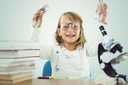 Curious little girl with test tubes and colorful substances makes tests at school laboratory. Small kid learning chemistry and conducts science experiment on biology lesson. Future microbiologist.