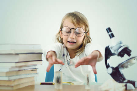 student girl on chemistry lesson. child pharmacist or apothecary. Scientific experiment background. young intern in chemical laboratory
