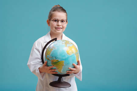 Portrait of little girl in white coat holding world map and smiling at camera against the blue background