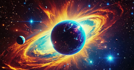 A large, glowing planet is surrounded by a dark sky. The planet is the center of attention, and the sky is the background. Concept of wonder and awesome at the vastness of the universe