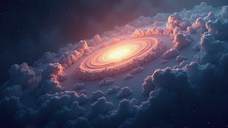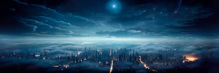 A cosmic perspective that highlights the Earth's luminous urban areas against the backdrop of the dark cosmos, with delicate clouds floating nearby. Generative AI