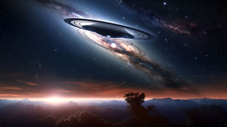 Three glowing spaceships illuminate the night sky above rocky mountains, surrounded by a mystical atmosphere.