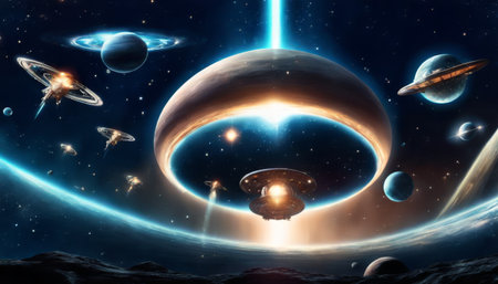 An imaginative space scene depicting a fleet of spacecraft orbiting a large ringed planet with a backdrop of distant stars and planets.. AI Generation