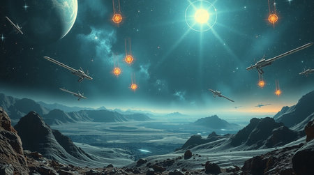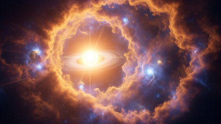 Stunning view of a cosmic landscape showcasing vibrant colors, numerous planets, and a blazing sun, evoking a sense of wonder about the universe's mysteries.