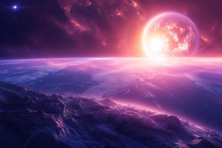 Fantasy alien planet in space against the background of the rising sun. 3D rendering
