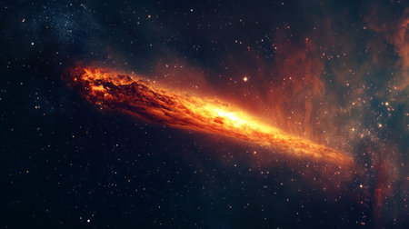 Burning comet tail streaking across the night sky, surrounded by bright stars and deep nebulae generative ai