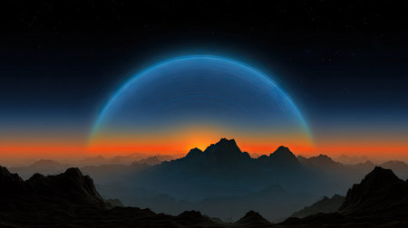 An artistic depiction showcases a mountain range beneath a bright, colorful sky. The composition utilizes a gradient of dark blue to orange, with a central arc of bright blue, suggesting a planetary view. This stylized image, with its dramatic lighting and shadow, could be suitable for various commercial or editorial uses.