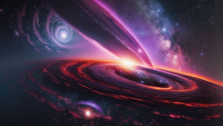 An AI generated illustration of majestic spiral galaxy with two bright stars at its sides, set against a deep and mysterious backdrop of space